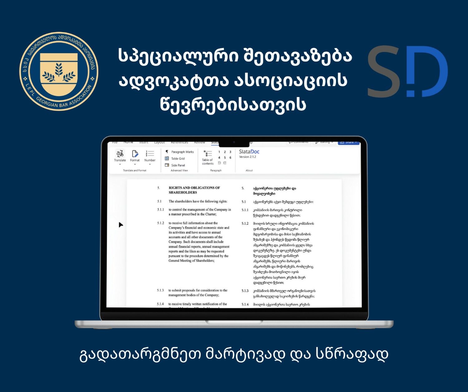 SlataDoc- ის Microsoft Word Add-in -ის საშუალებით იღებთ ხარისხიან იურიდიულ AI თარგმანს პირდაპირ თქვენს დოკუმენტში თქვენთვის სასურველი განლაგებით.